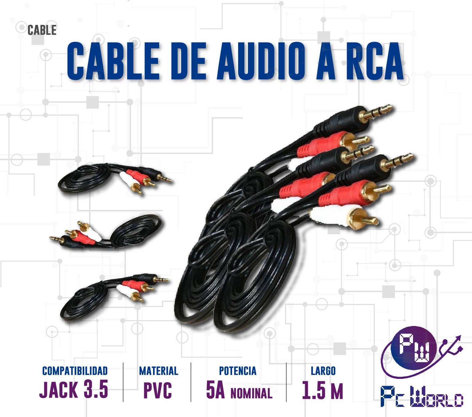· Tipo de conectores: Mini Plug jack 3.5 mm MACHO a 2 RCA MACHO.