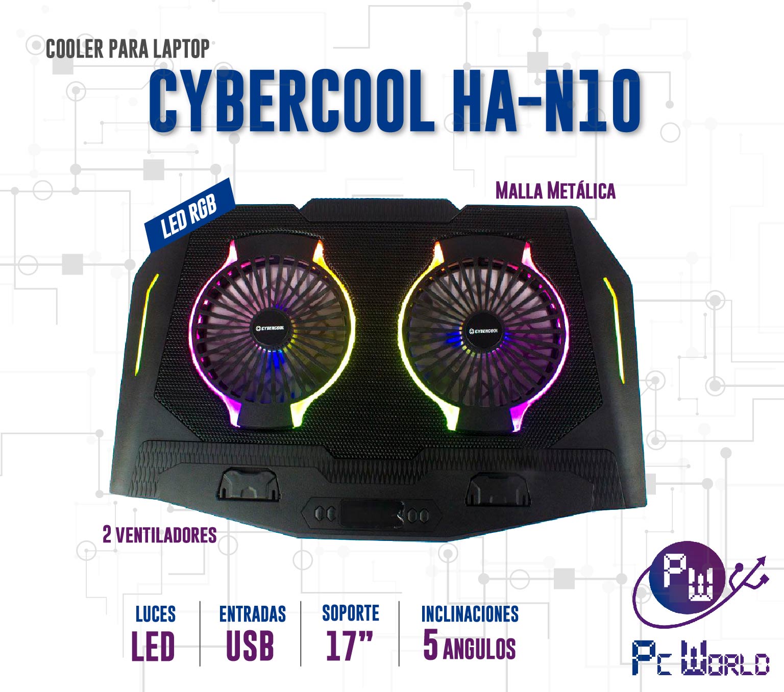 Cooler para Laptop de 14 a 17 pulgadas. Cuenta con 2 Ventiladores de 14 cm, Luz RGB y Cintas de Luz RGB. Pantalla LCD, Stand gradual. Alimentación USB y Hub de 2 puertos USB.